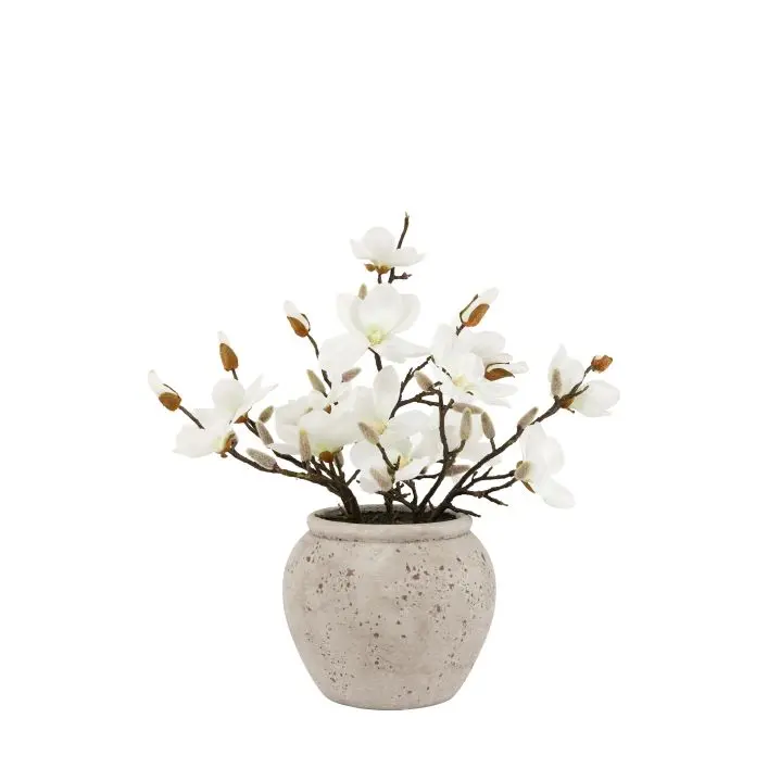 Magnolia Vase Arrangement: With a real feel quality, these beautiful Magnolia stems and white flowers will bring a little spring to an interior. The modern cement style pot adds a fresh touch to a classic flower.