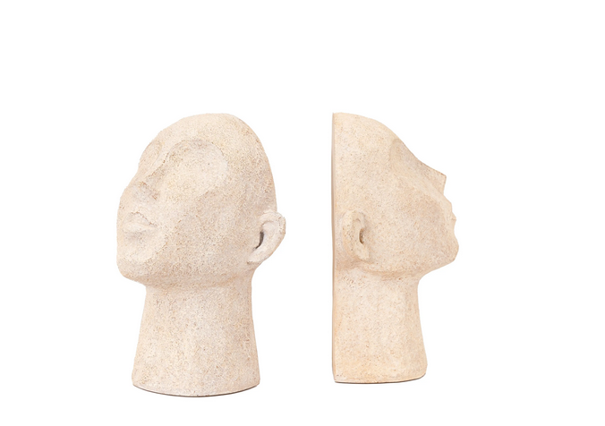 Meori Bookend Cream (Set of 2): Pair of characterful sculpted head bookends made from a pale stony effect resin. Perfect for keeping your books neat and organised.