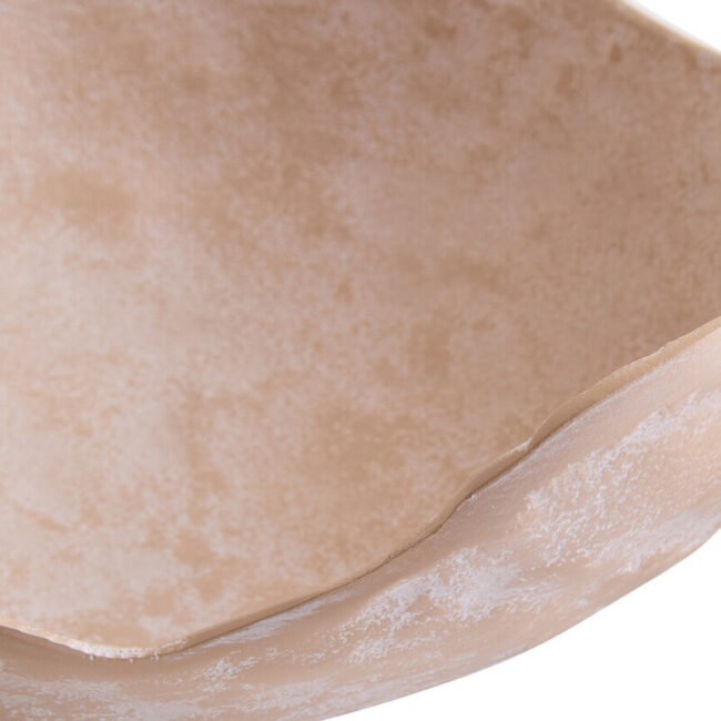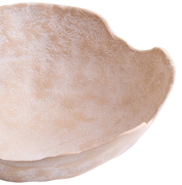 Densee Set of Two Textured Beige Whitewash Bowls: The Densee set of two textured bowls combines rustic texture and natural form. This set includes one large and one small bowl, both featuring undulating rims with organic shapes. The bowls have a beige finish that is subtly layered with a whitewash. This set of two bowls will add a modern touch to any living space.