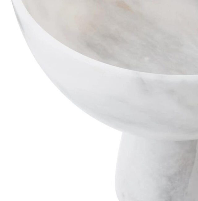 Almos Marble Pedestal Bowl: The Almos large pedestal bowl is a statement piece that combines elegance, craftsmanship, and functionality. Expertly crafted from white marble, it showcases subtle grey veining, creating a natural pattern that ensures each bowl is truly unique. Resting on a wide conical base, the bowl provides stability but also enhances its modern aesthetic, giving it a contemporary look.