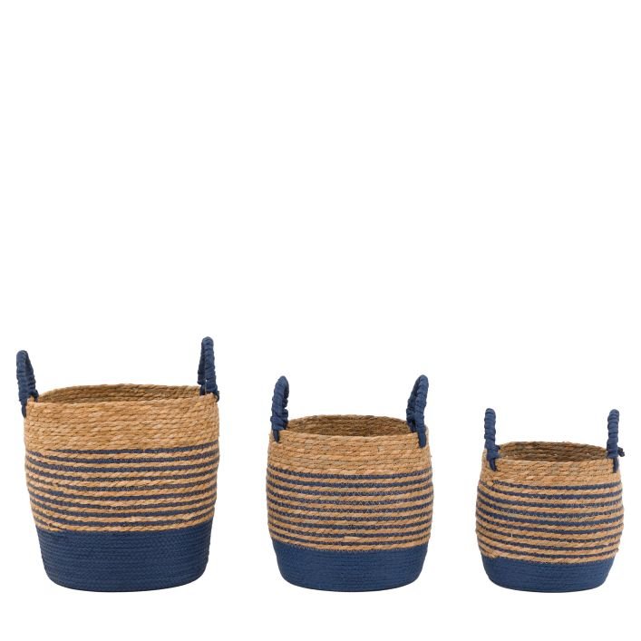Sail Seagrass Basket Striped Set of 3: Made for easy and stylish storage around the house, this set of 3 baskets are perfect for toys, blankets, spare linen or anything else you need to tidy away. Handwoven with paper and seagrass the baskets features blue stripe details and easy carry handles.