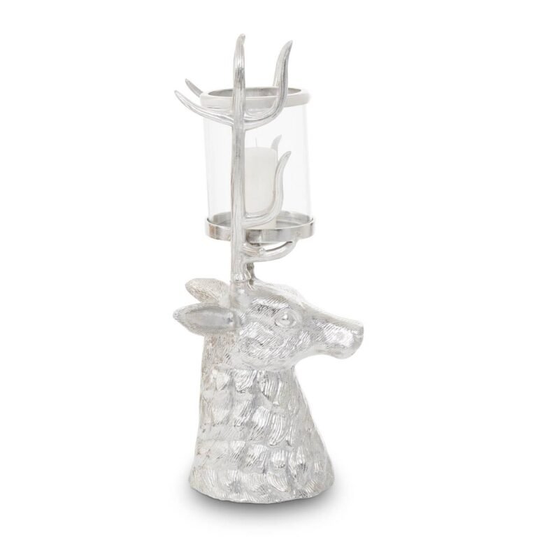 This candle holder is made from sturdy metal and rendered intricately to form a stag head. The round clear glass holder is fixed neatly between the antlers to create an ambient glow and instant focal point with the silver nickel finish on the sculpture.