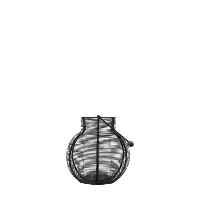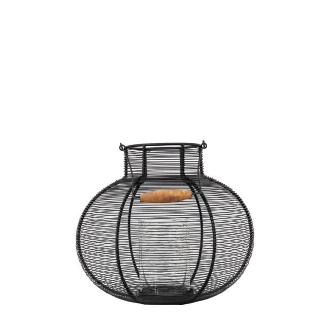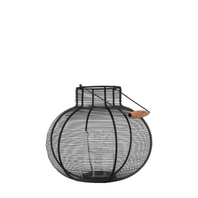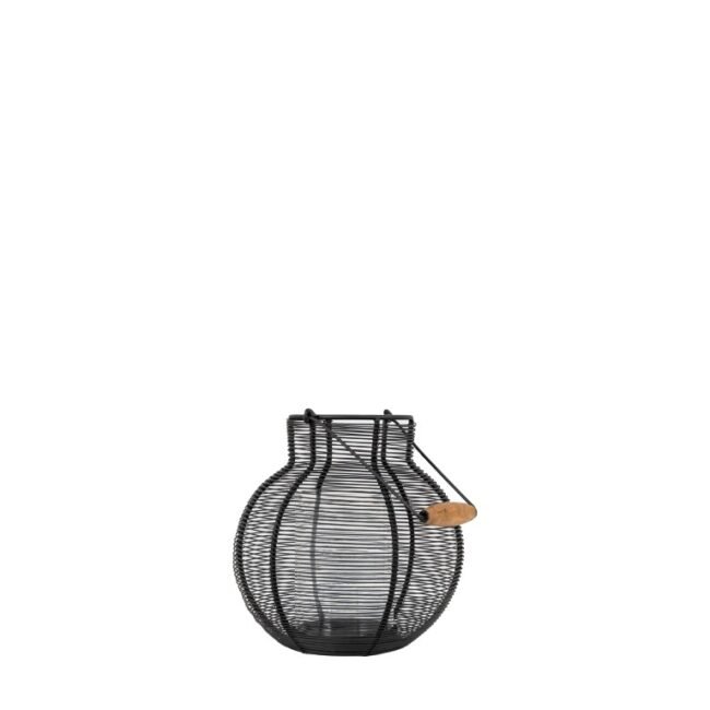 Crafted from woven wire, this lantern adds a warm ambience to your space. The rounded black woven wire basket has a fluted top and wooden basket handle. 2 sizes available. Candles not included.