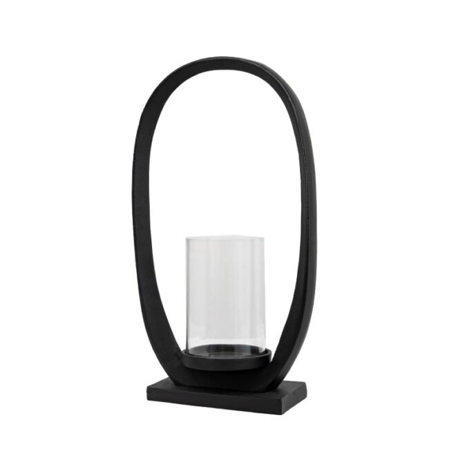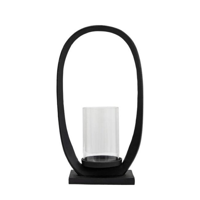 A contemporary twist on a lantern. the bold loop shape surrounds a simple glass cylinder, creating a stand out modern piece. Perfect for adding a warm glow to your room. Matching larger lantern available. Candle not included.