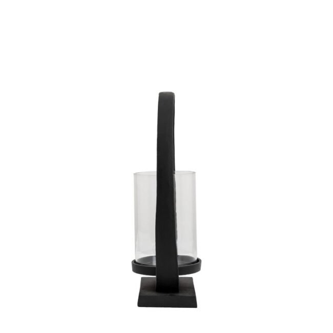 A contemporary twist on a lantern, the bold loop shape surrounds a simple glass cylinder, creating a stand out modern piece. Perfect for adding a warm glow to your room. Matching smaller lantern available. Candle not included.