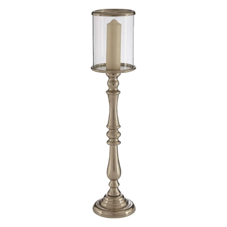 The candlestick has a large round base with a stepped design that tapers up to a stand that features knop detail and concave lines. Made from aluminium, it has a nickel coating with a mildly distressed finish that adds texture to its surface. Its clear glass hurricane shade is trimmed with polished aluminium and is suitable for displaying a pillar candle.