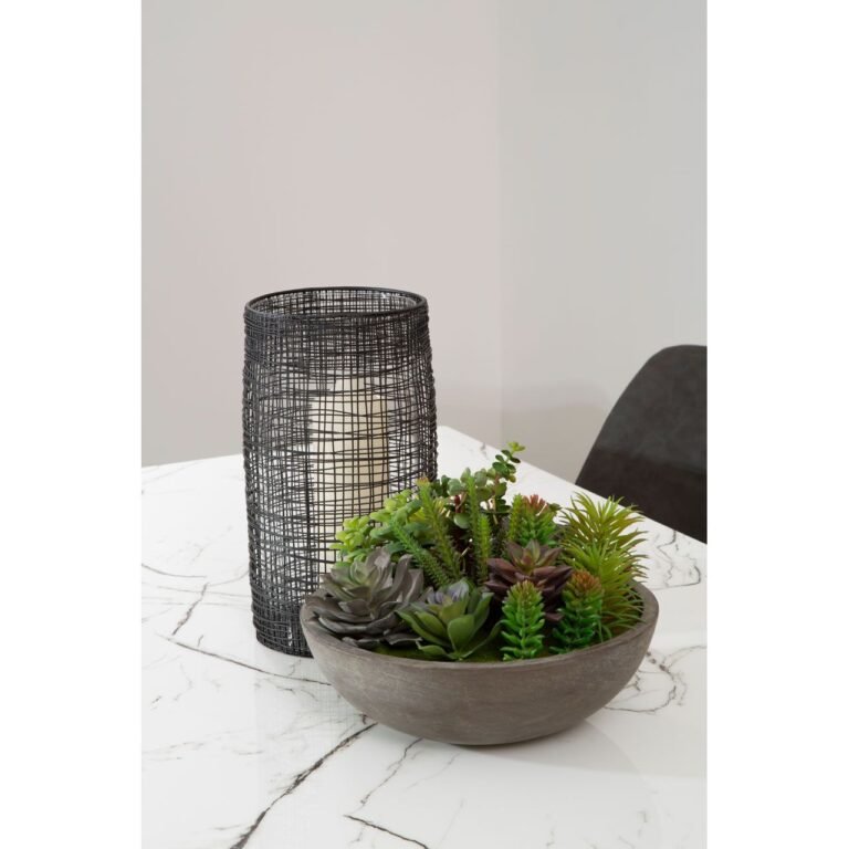 Mossley Cylindrical Tall Lantern: This cylindrical lantern features sleek black metal wires which neatly intersect each other forming a minimal grid design. It has a transparent glass shade inside which is designed to hold a pillar candle. Ideal to cast an ambient glow to its surroundings, this lantern will elevate lighting in a contemporary living room or hallway.