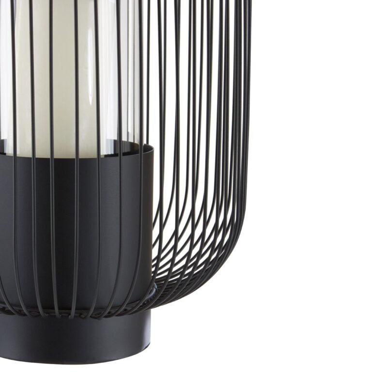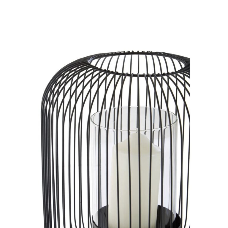 Sleek black finish iron wires combine to form the cage shape frame of this Mossley Large Lantern. The centre is fitted with a glass shade to hold a single pillar candle and is complemented with a hollow top. The configuration of the wires creates an openwork effect. This contemporary lantern will look decorative sitting on a mantle or side table.