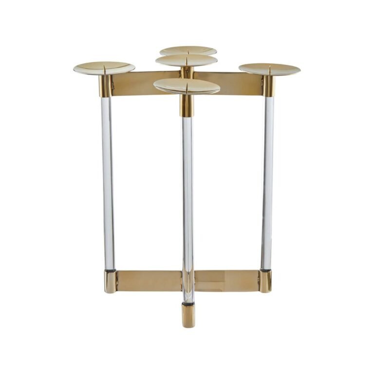 Pendle Gold Finish Candelabra: This sleek and reflective candelabra is made from smooth stainless steel and features on-trend acrylic elements. The gold colour produces a reflective finish. It has five round sconces that are perfect for displaying pillar candles.