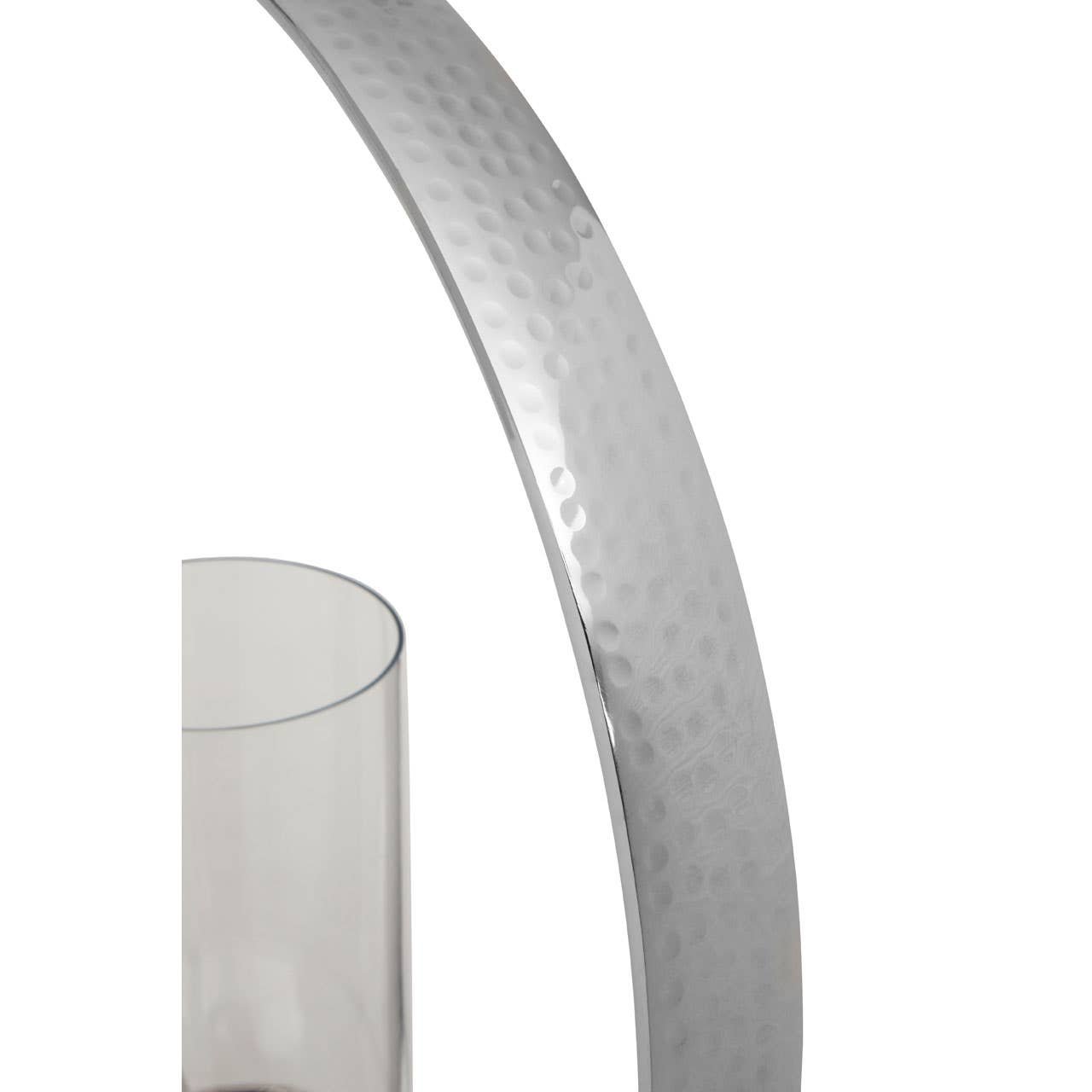 The large Riqua Large Silver Candle Holder features an O-shaped design, framing the central glass lantern, with a rectangular pedestal raising the holder. A stylish silver finish lends the candle holder luxe appeal.