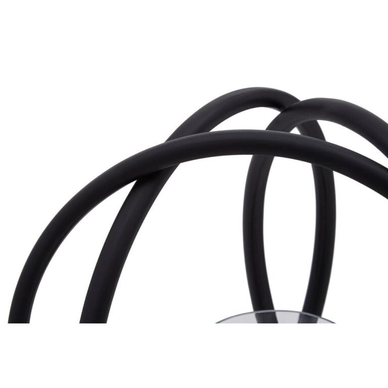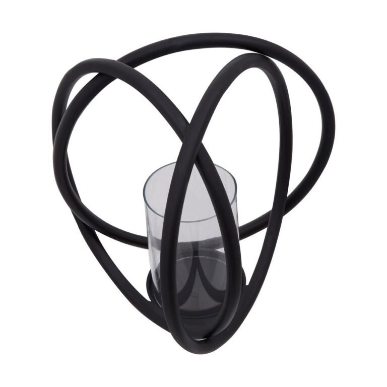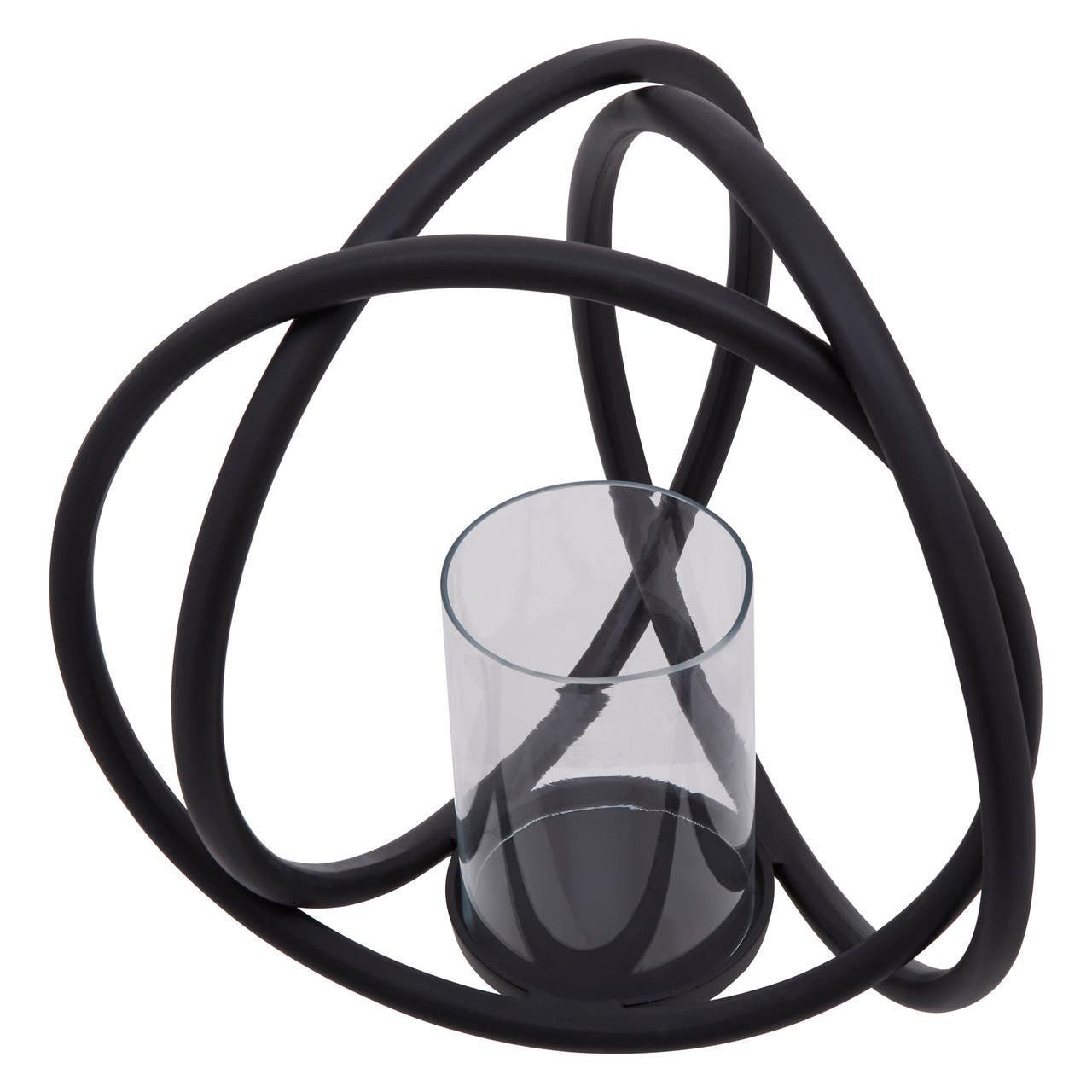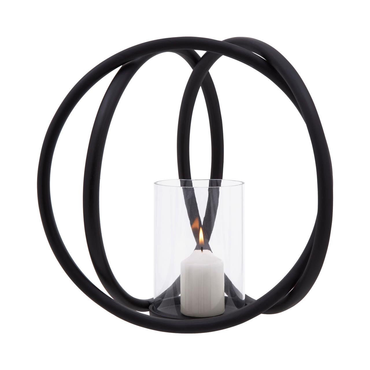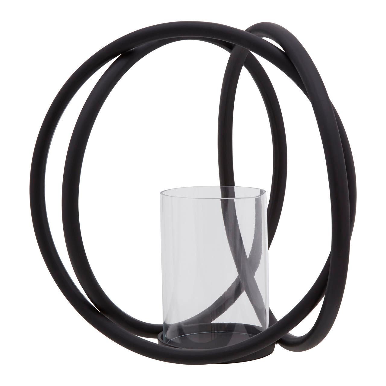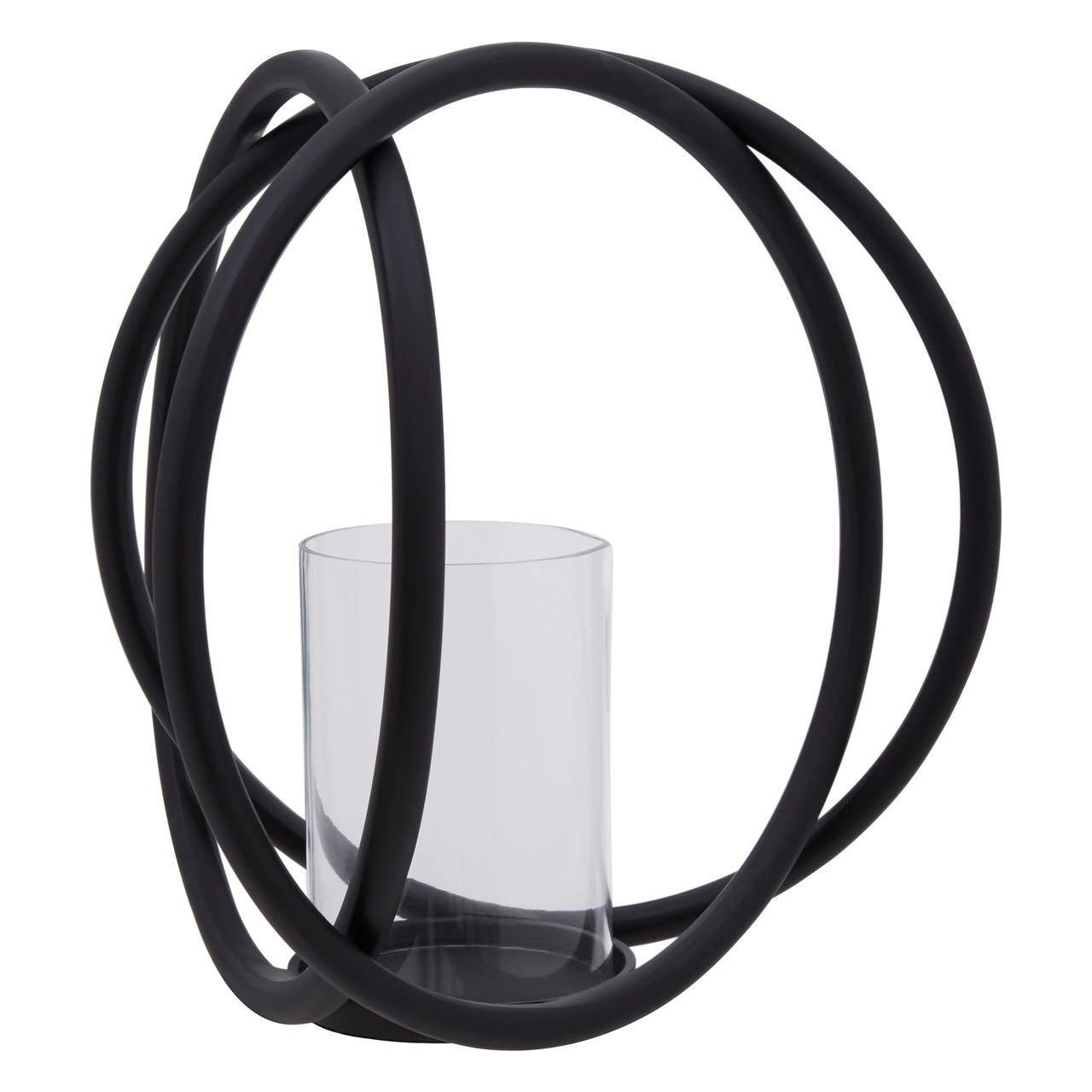 A sculptural piece, the Rura Matte Black Medium Candle Holder is an eye-catching design of interconnected matte black rings encompassing a clear, glass insert, best suited to a pillar candle. Style as a centerpiece on the dining or coffee table.