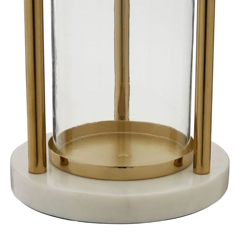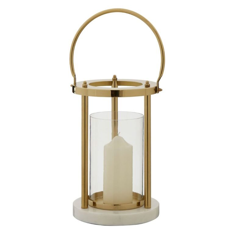 Sunninghill Hurricane Lamp With Handle: Its metal frame follows traditional hurricane design, with straight lines and a rounded top and bottom expressing the classic silhouette. The gold finish on the frame and the large handle introduces a reflective hint. The frame is set into a base crafted from solid white marble, and a clear glass shade provides a shield for a pillar candle.