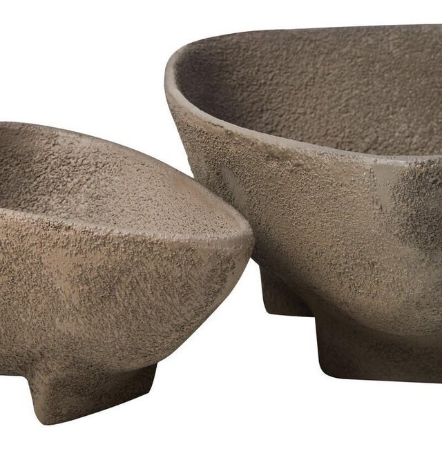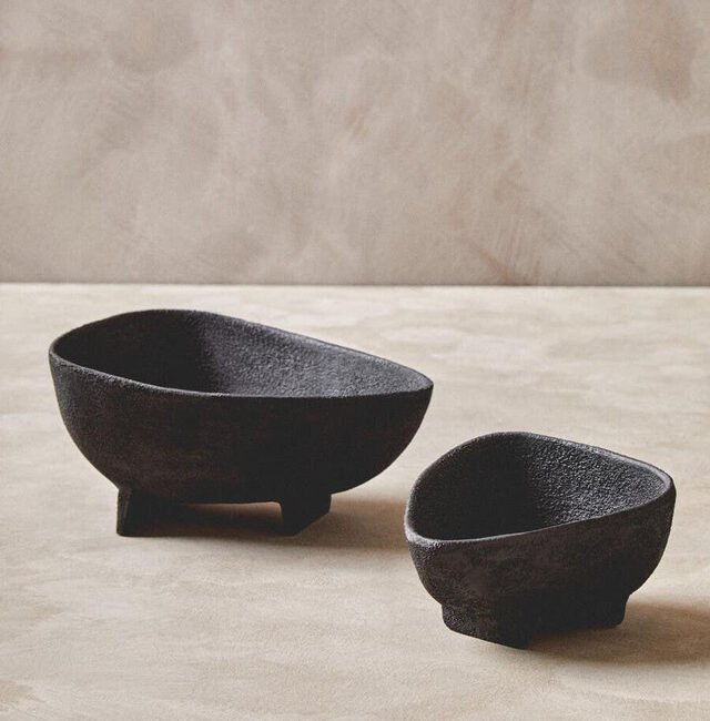 Riva Set of Two Textured Bowls: The Riva set of two textured aluminium bowls creates a dynamic visual appeal with artfully curated sides, adding depth and character to the interior. Each bowl is perched on a footed base, enhancing its aesthetic while ensuring stability and style.