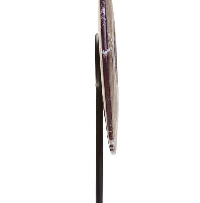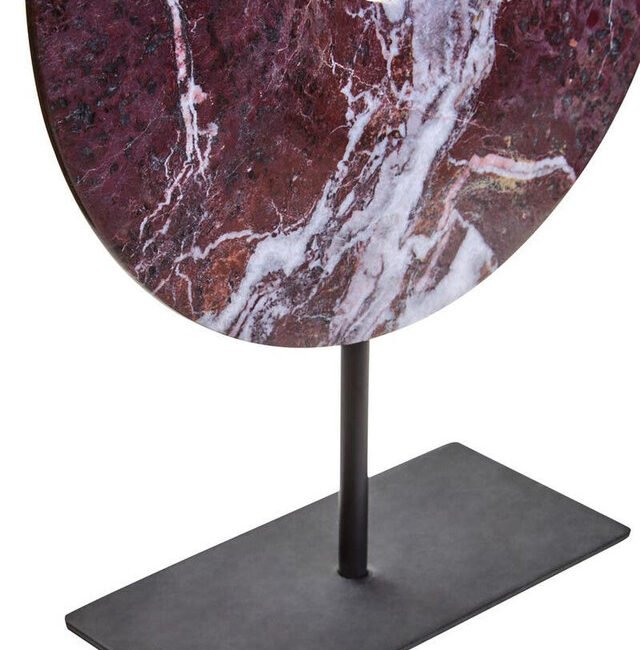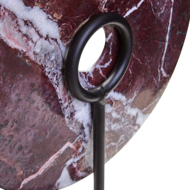 Almos Red Marble Round Disc Sculpture: This timeless sculpture features a smooth, round red marble disc with the distinctive natural veining and a polished finish. The sculpture is gracefully displayed on a contemporary black metal stand, offering a clean and minimalist aesthetic.