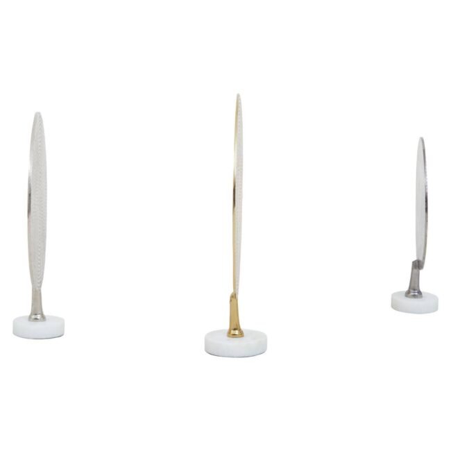 Eli Set Of Three Gold Silver And Black Hammered Metal Sculptures: The Eli set of three hammered metal sculptures are the perfect addition to an art lovers home. Each sculpture has a hammered metal disc on the top in either, gold, black or silver with a luxe marble base.
