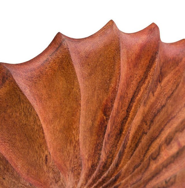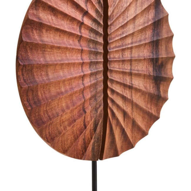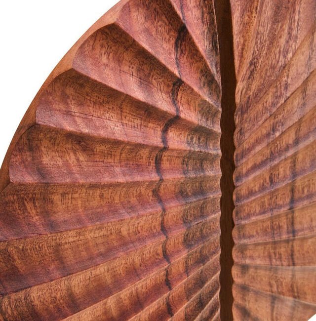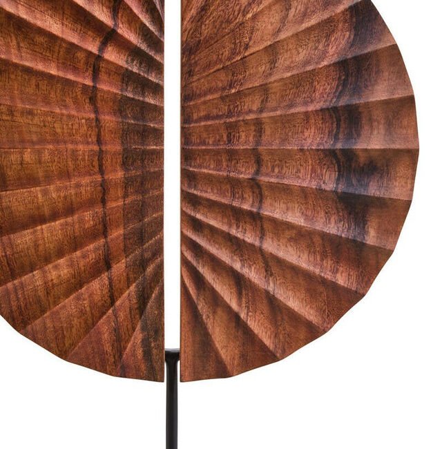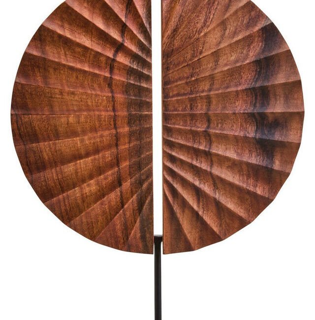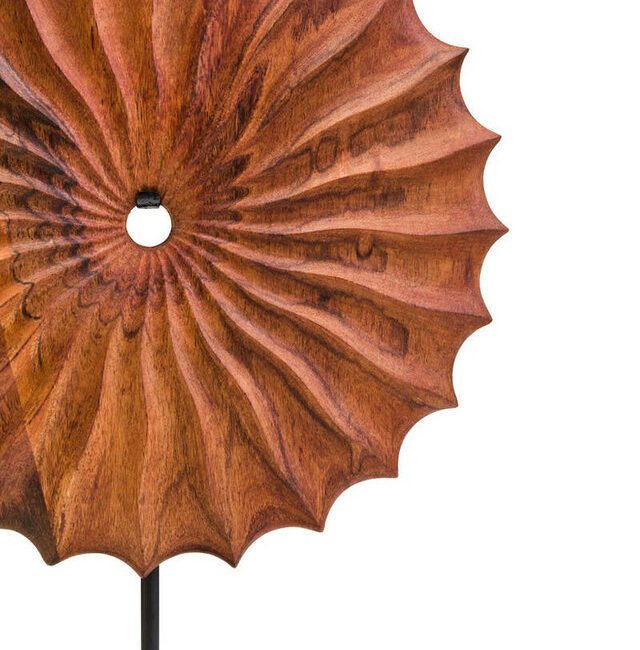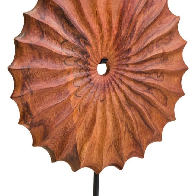 Esto Wood Sculpture with Black Base: This Esto sculpture is handcrafted by skilled artisans, featuring a carved natural wood disc with a radiating, segmented design. Each segment curves outwards from a central opening, creating a dynamic sense of movement and texture. The sculpture is mounted on a contrasting, sleek black-finish metal base, adding stability and style to the design. *Due to the inherent nature of natural materials and the handmade process, slight variations in colour, grain and texture may occur.