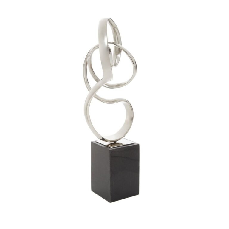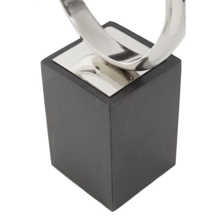 This Farnley Nickel Finish Knot Sculpture in the reflective silver finish neatly sits atop the black marble block base creating a monochrome contrast. This piece with intertwining lines is sure to make a decorative statement on a mantle or bookshelf.
