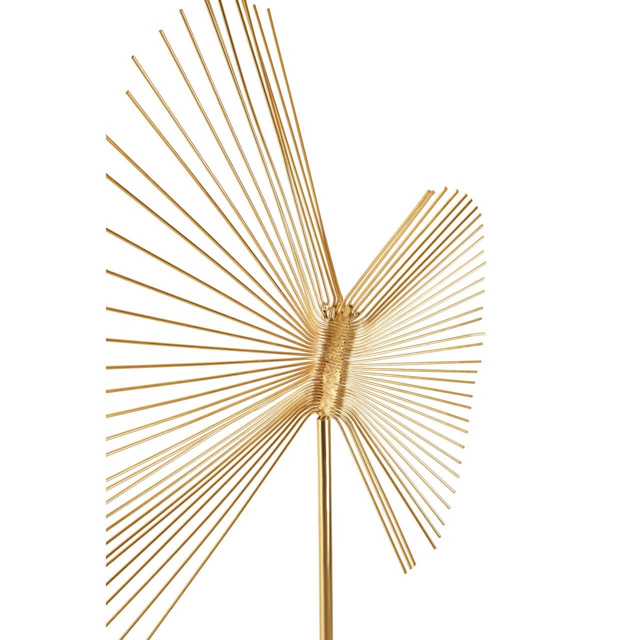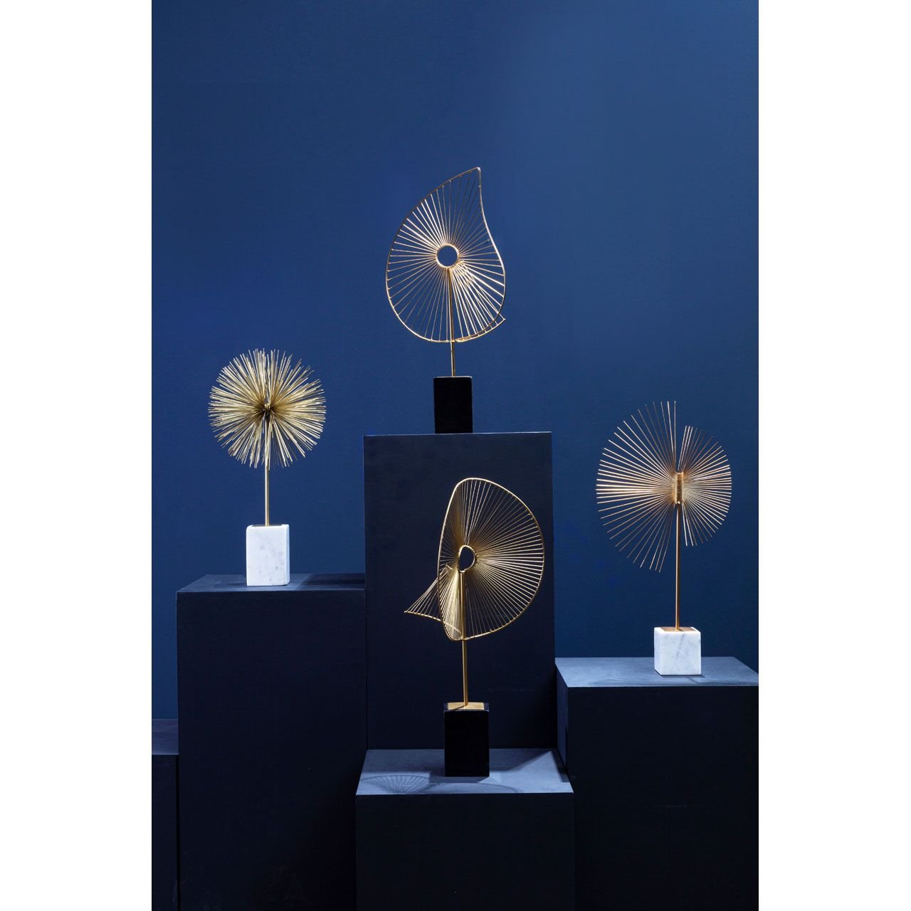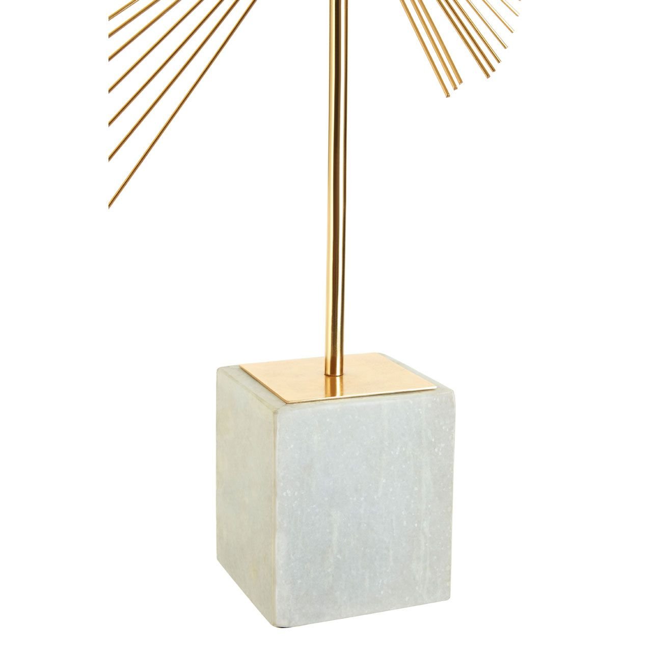 Made from iron, this abstract Farnley Spiral Sculpture combines sleek metal wires to form a fan-shaped design. The fanned out golden finish lines give a moving effect in a combination of classic and modern touch with its shades and design. This decorative piece is mounted on a white marble block base which lends it support and stability.