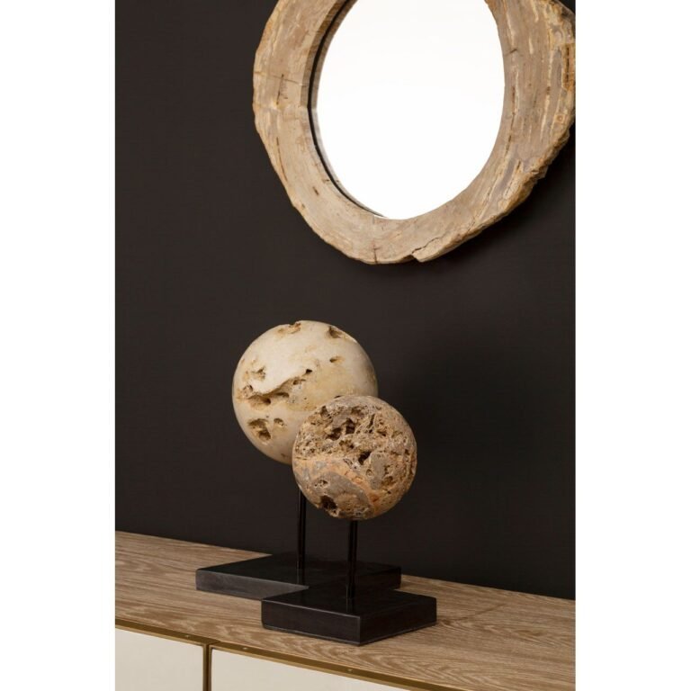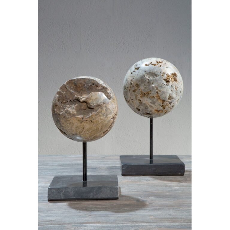This Guise Large Cheese Stone Ball is created from a ball of natural cheese stone. The porous stone has complex patterns, and boasts contrasting polished and rough finishes. The neutral-toned ball sits atop a black polished metal stand with a square base.