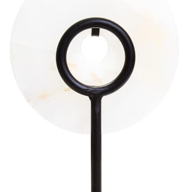 Layna Extra Small Round Dia 15cm Onyx Disc Sculpture: This timeless extra small sculpture features a smooth, round onyx disc with the organic patterns and natural veining of the stone highlighted by a polished finish. The sculpture is gracefully displayed on a contemporary black metal stand, offering a clean and minimalist aesthetic. *Onyx has natural variations in colour, veining, and patterns; therefore each piece will have unique characteristics that vary from the sample image.