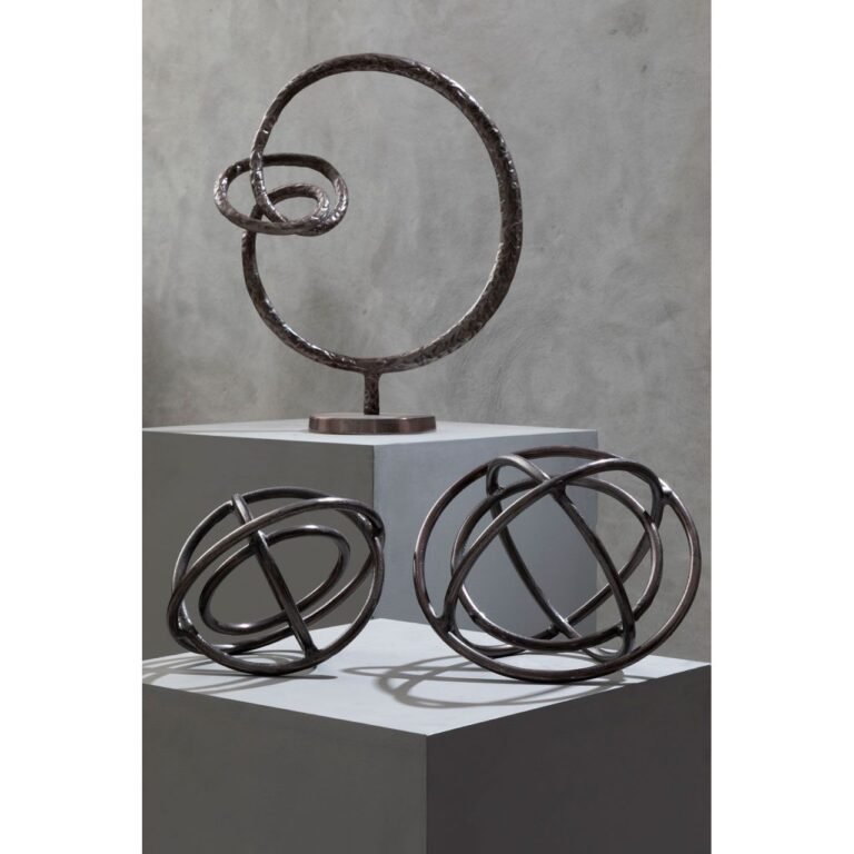 Lume Round Rough Bronze Sculpture: Its smooth round base contrasts with the uneven, curling, knotted form of the sculpture above. Formed from aluminium it has a rough bronze finish.