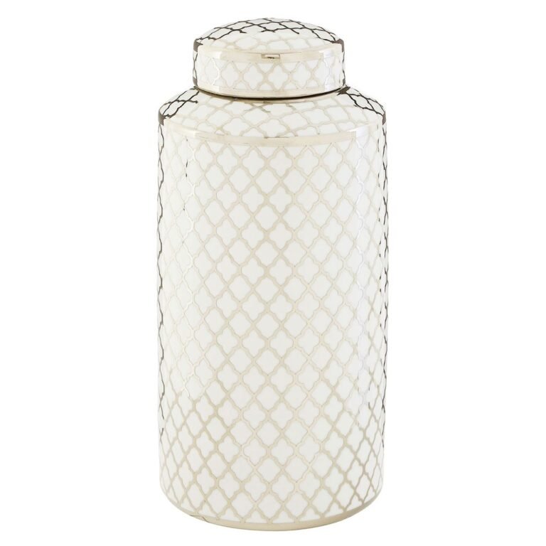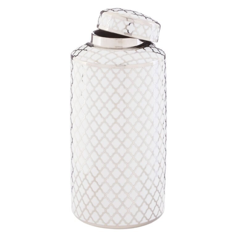 The Mondere Large Jar is made from smooth ceramic, glazed to give it an added layer of sheen. It has a crisp white base colour, with a silver quatrefoil pattern inspired by Arabesque design. The jar has a cylindrical design, with narrow shoulders that angle upwards to the round lid. Coordinate it with silver metallic textiles and lighting.