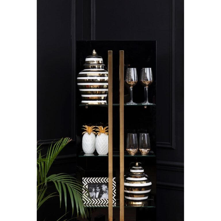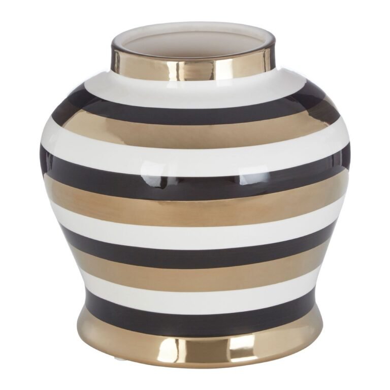 Oinki Small Ceramic Jar: Alternating horizontal stripes of gold, white and black decorate the Oinki jar and accentuate its bold curves. The jar features a removable flared lid.