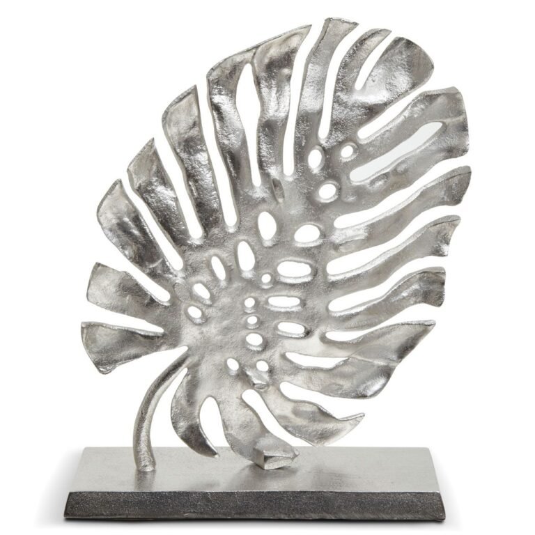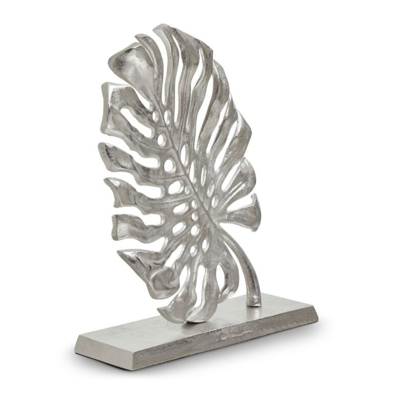 Inspired by tropical leaves, this Ralkie Leaf Sculpture will add hints of art deco with its elegant and intricate design. Silver finish textured leaf sits atop a rectangular base that seamlessly blends with nature-inspired homes.