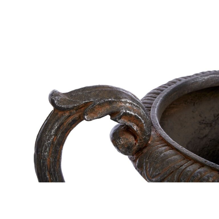 Formed from strong and lightweight fibreglass, this highly textured decorative Stone Effect Urn – 59Cm evokes antique style with its weathered brown colour and speckled texture. Imitating the style of classical urns, it features decorative curving handles with a floral effect, which connect to a similarly curled lip with a petal design embossed into it.