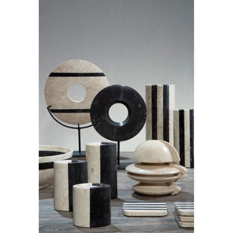 The ring shaped Uril Marble Sculpture is crafted from luxurious cream marble, with beige and grey veining creates a distinctive pattern on the glossy polished natural material. Two parallel stripes of black marble cross through the sculpture creating a striking contrast. The ring shape is tapered from the centre resulting in a slender outer edge.