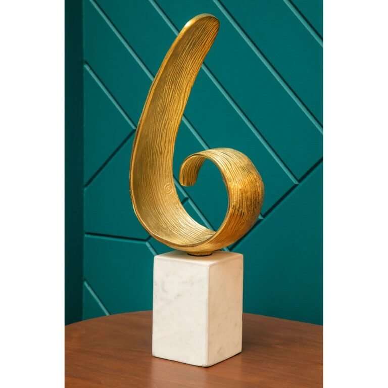 Textured gold finish sculpture gently twists to form a wave-like design. Mounted over the white marble base, this Url Sculpture will add a touch of glam appeal to modern home decor.