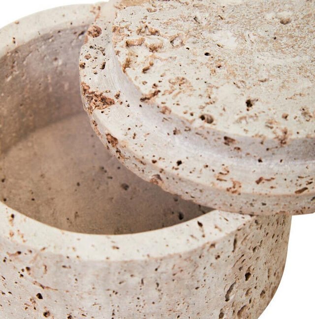 Borit Travertine Round Trinket Box: The Borit round trinket box is made from travertine, a natural limestone known for its fibrous texture in earthy and neutral tones. This round trinket box boasts a timeless finish and adds a touch of luxury to any mantel, console table, or living room table. *Due to the natural materials used in the creation of these products, slight variations in colour, texture, and size may occur. These natural variations are an inherent characteristic and should be considered part of the unique beauty of each piece.*