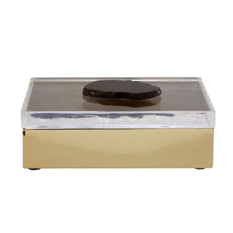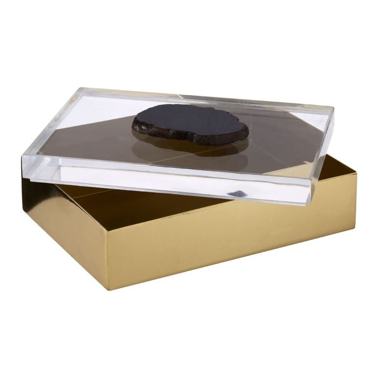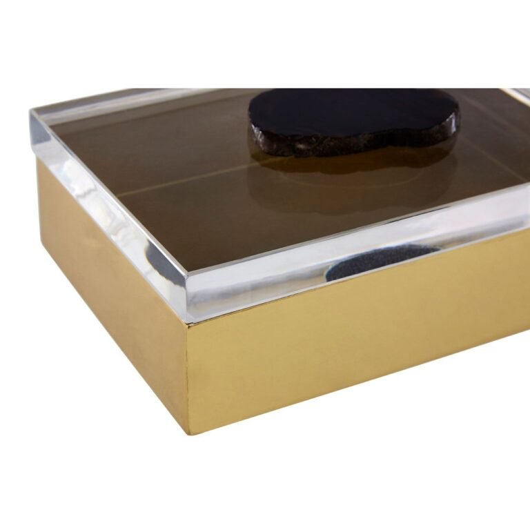 The Bowie Black Agate Large Trinket Box case is made from smooth steel and has a luxurious gold finish that complements textiles and lighting with a warm metallic colour. Its lid is formed from a thick piece of clear acrylic that extends very slightly over the rim of the case. The agate stone is polished to make it smooth to the touch and has an asymmetric shape that subverts the angular lines of the box. *This item is handcrafted so please expect slight variations to the finish*