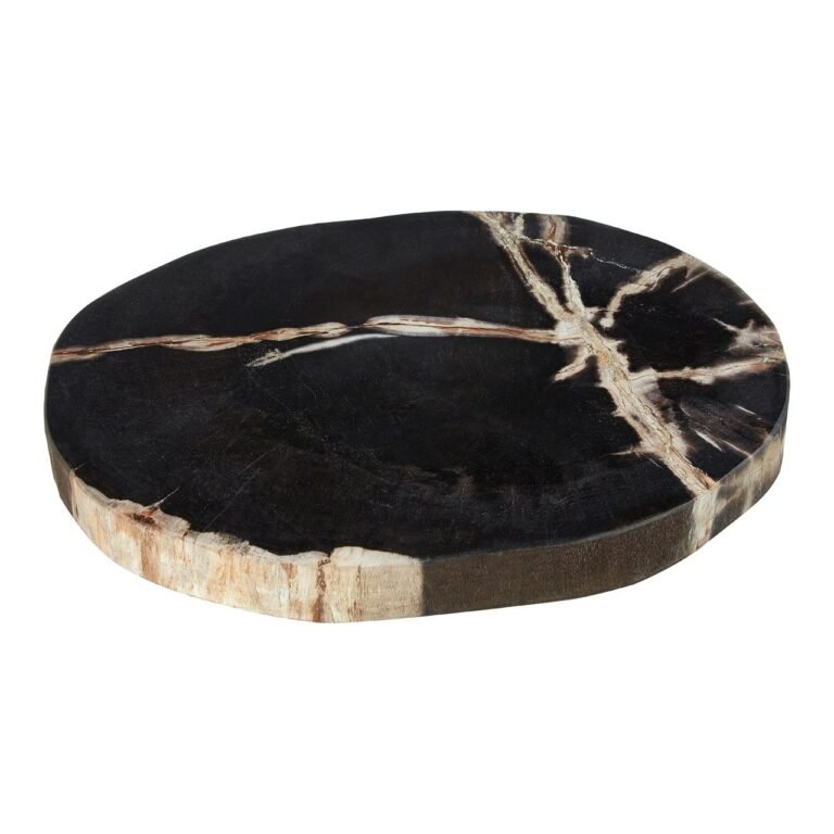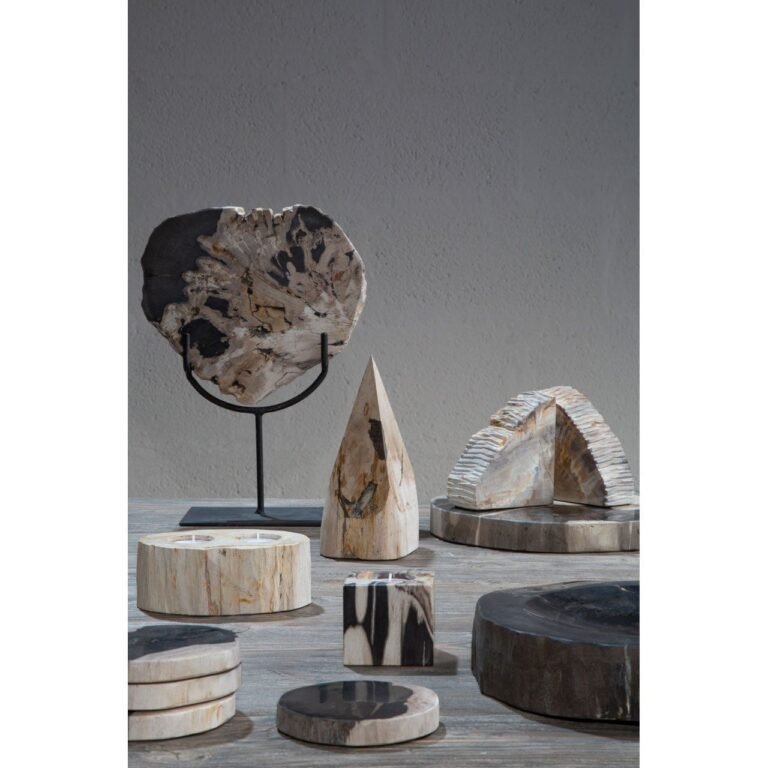 The Guise Serving Board is formed from petrified wood – the fossilized remains of an ancient tree trunk. Its asymmetric round shape is characteristic of the natural material. Dark black colours contrast with light natural wood tones, with prominent cracks and graining creating distinctive patterns.
