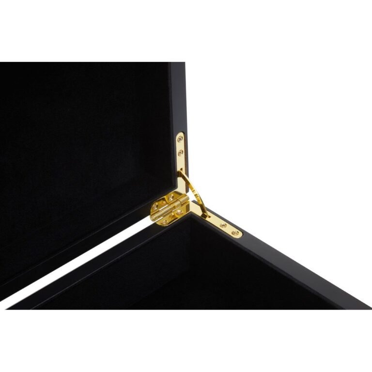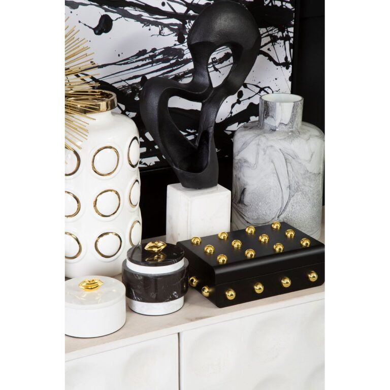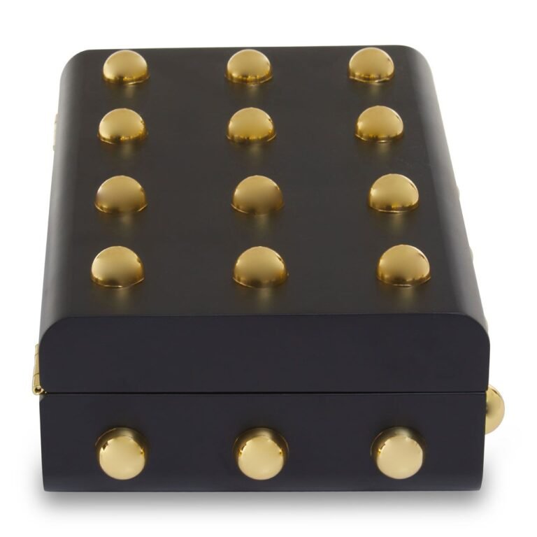 Kahlo Black Trinket Box: This small trinket box in the black finish is a classic combination of organic and modern style. Skilfully made from MDF and accentuated with stud detail in the warm metallic finish, this trinket box brings a luxurious touch to side tables and vanities.