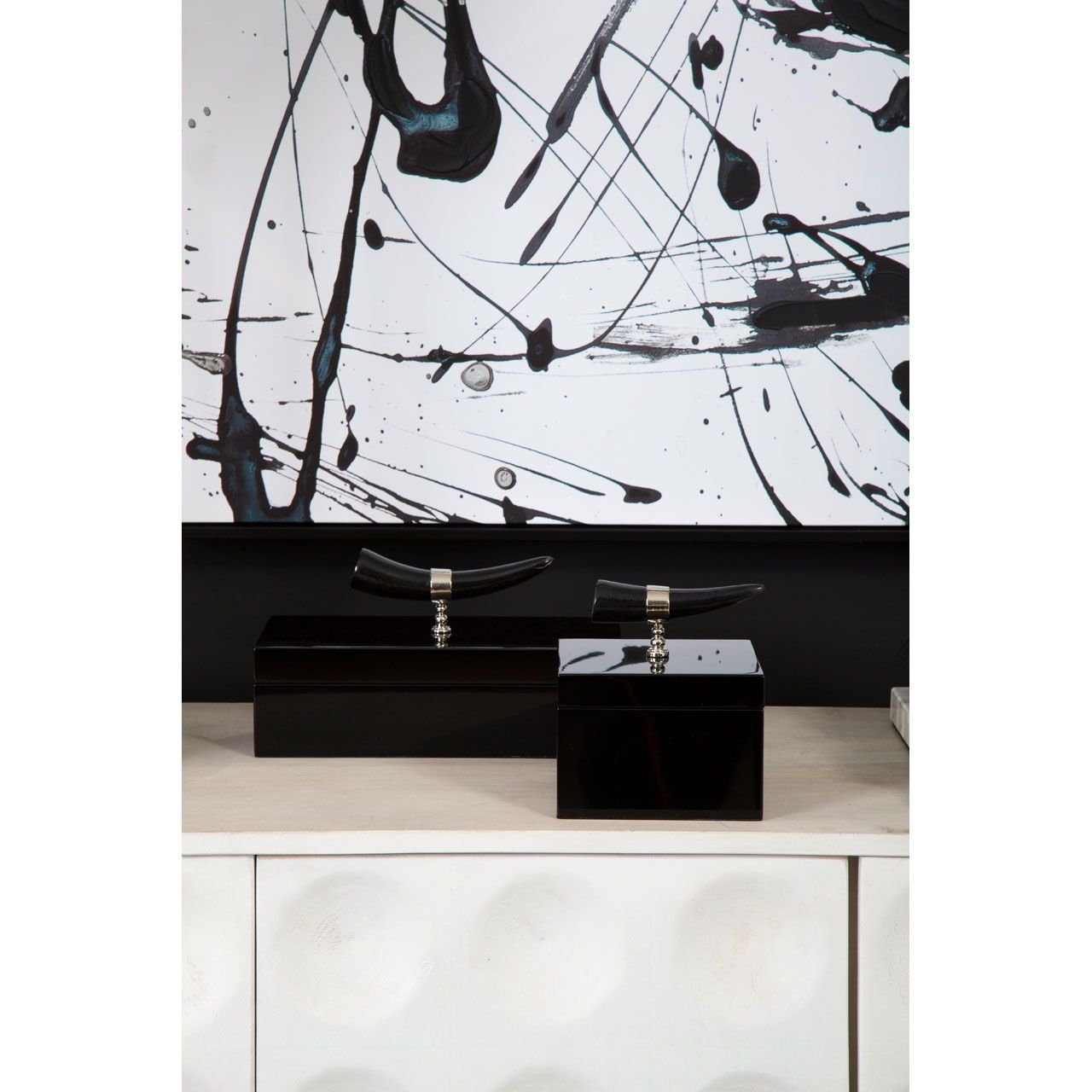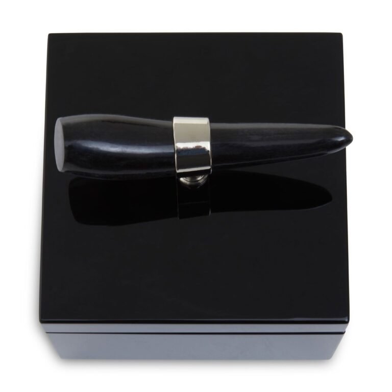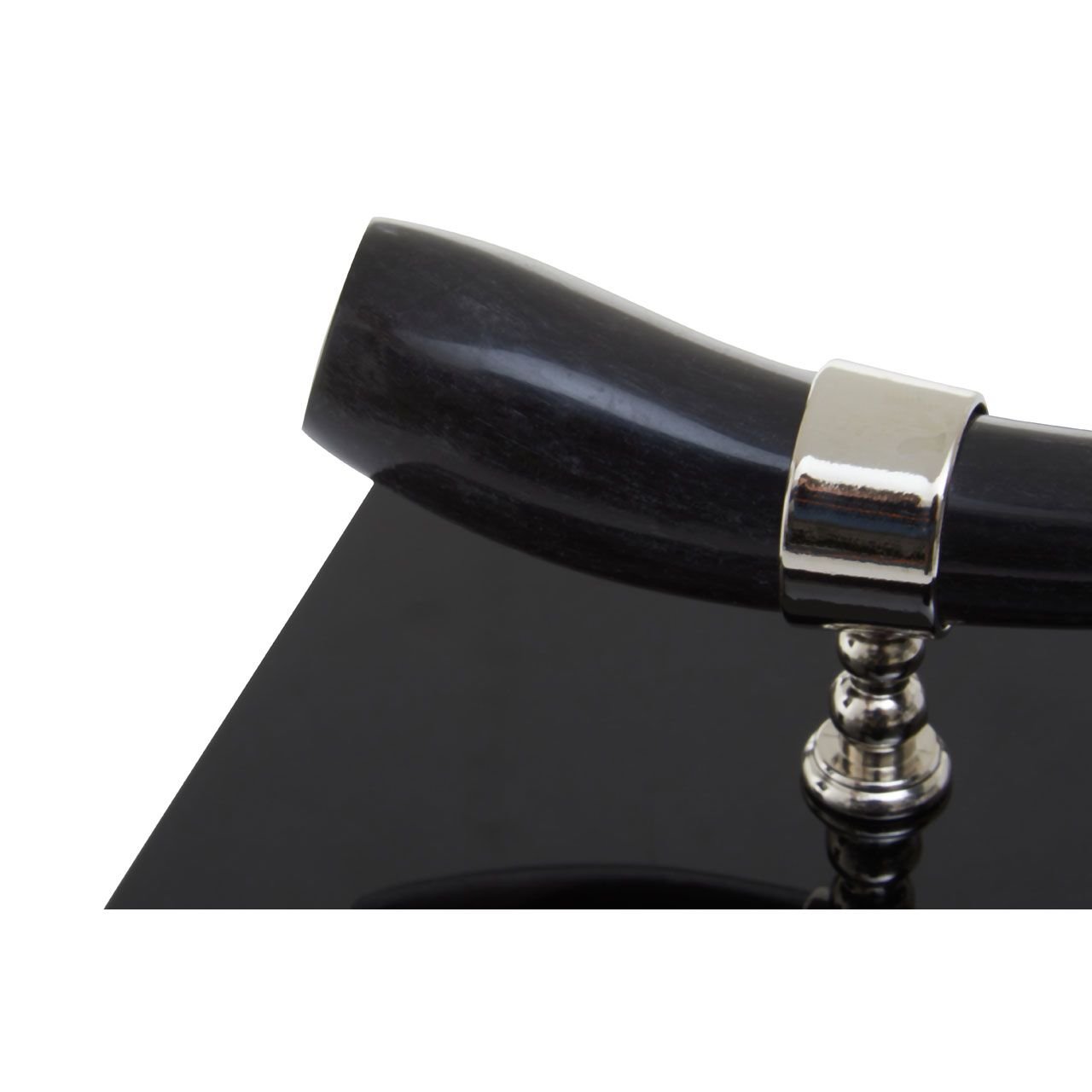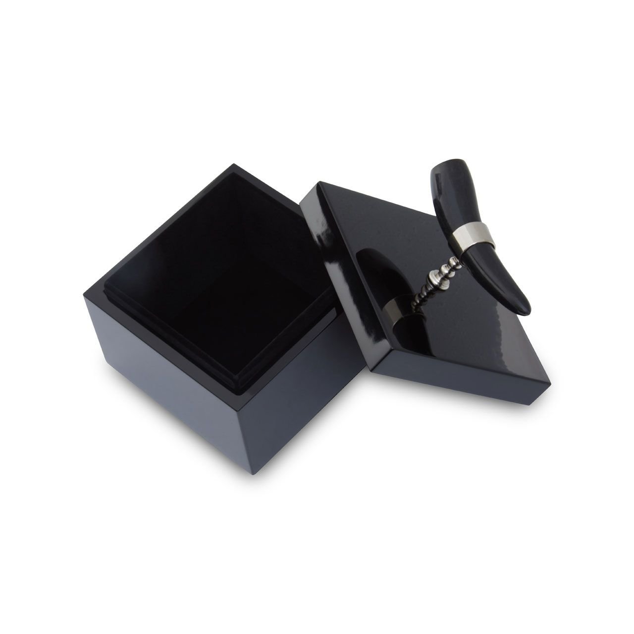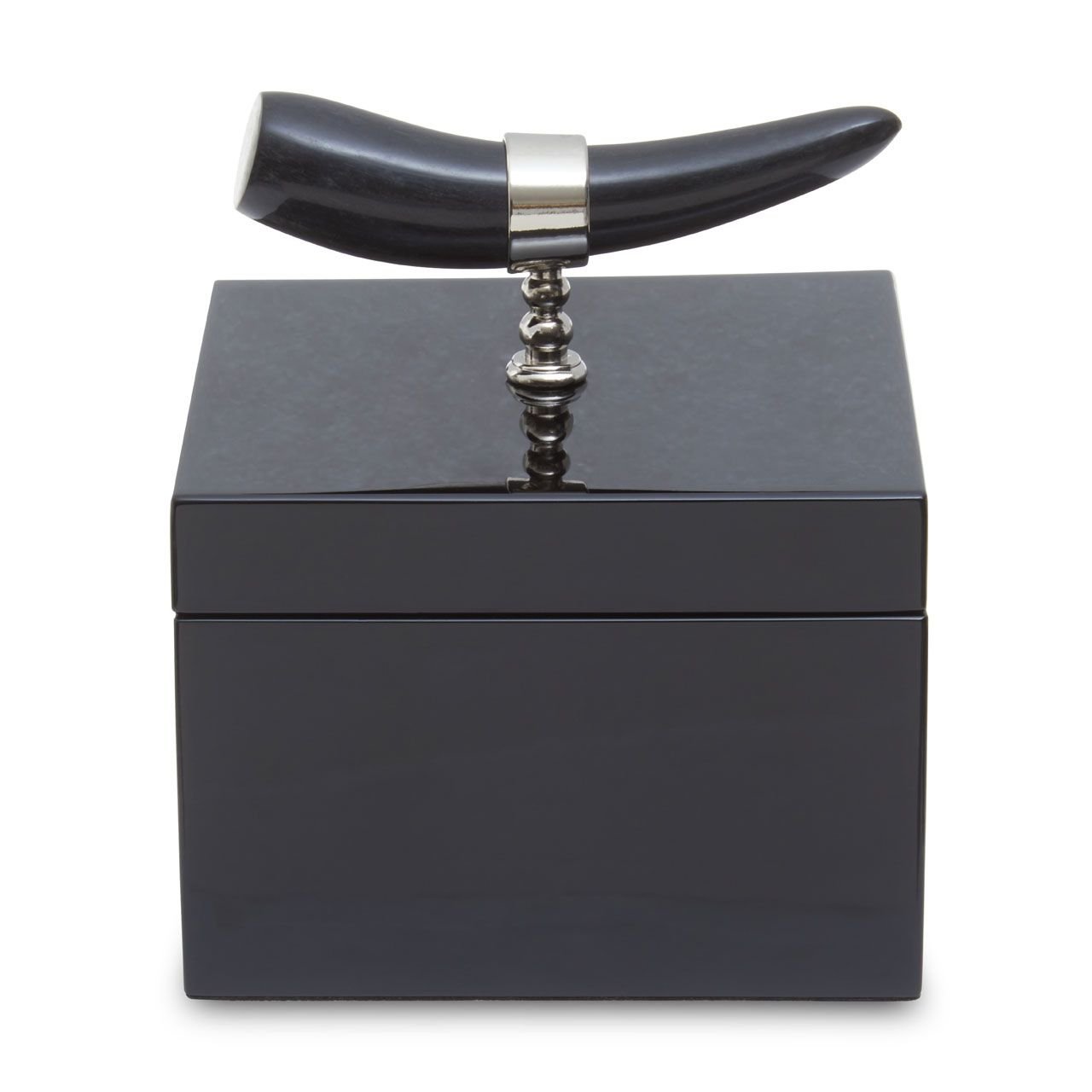 Skillfully handcrafted, this Ortna Square Trinket Box is adorned with a horn handle and given a smooth black finish. With a removable lid, this square trinket box ensures jewelry items are organized and close to hand.