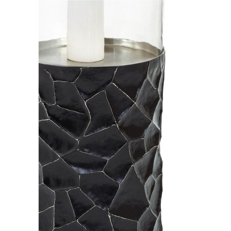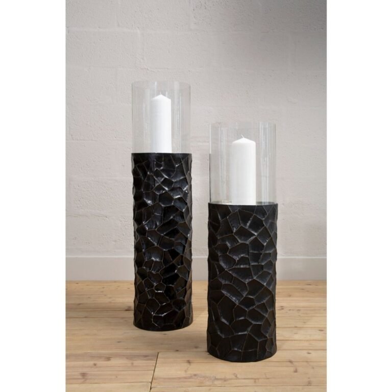 Artistically hand hammered, this large floor standing candle holder has textured pattern enhanced by the minimal warm metallic trim. The Cole Large Vase clear glass insert sits atop the stand to hold pillar candles.