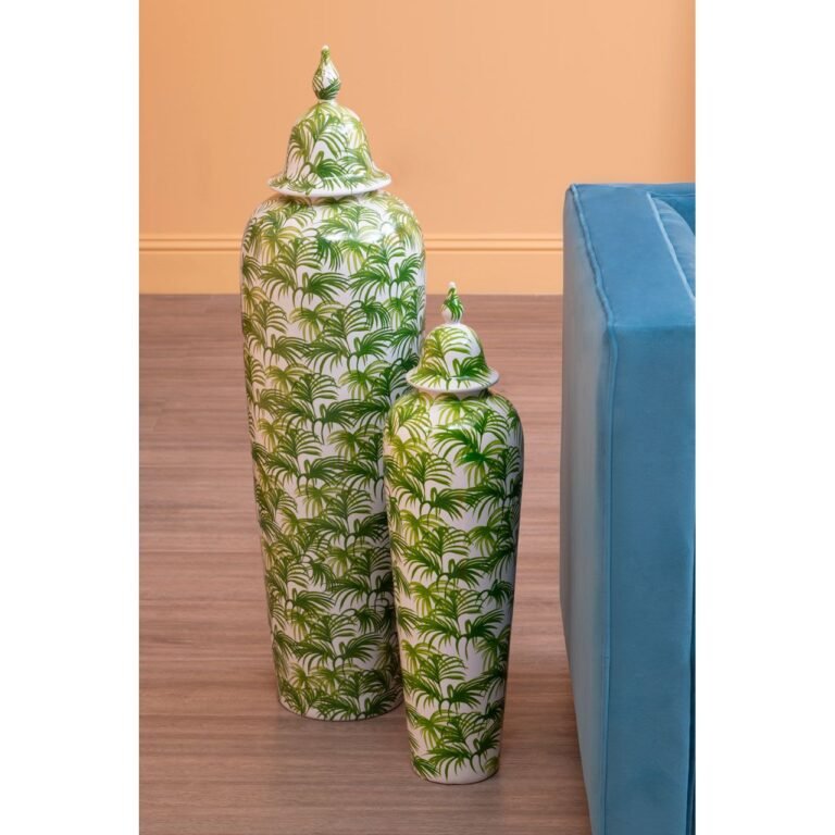 Delmy Small Botanic Jar: This ceramic jar features intricate green botanical detailing over a smooth, white surface. The elegant, tapered base matches the removable lid with a decorative finial that completes the traditional design.