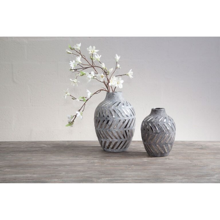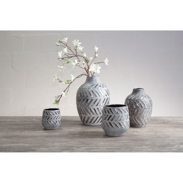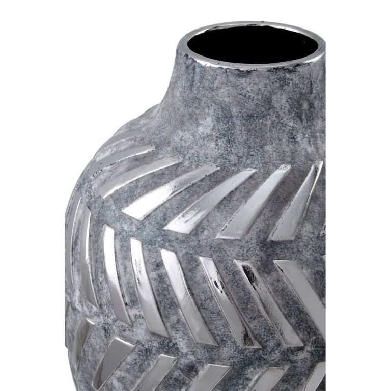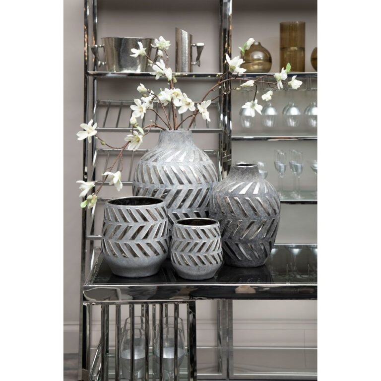 Laine Large Ceramic Vase: Expertly handcrafted by skilled artisans, this ceramic vase comes in a muted grey shade with geometric detailing. A combination of luxe and understated styling, pair this vase with the Helaine large and small planters in a boho inspired decor.