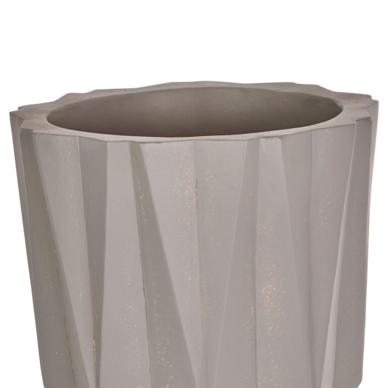Neil Large Grey Multifaceted Planter: The planter stands on three legs crafted from solid beechwood. The grey finish is slightly distressed to accentuate the textured geometric design. Suitable for outdoor use, it can decorate the garden or patio as well as interiors.