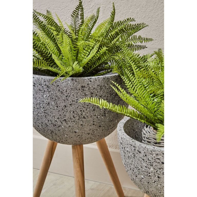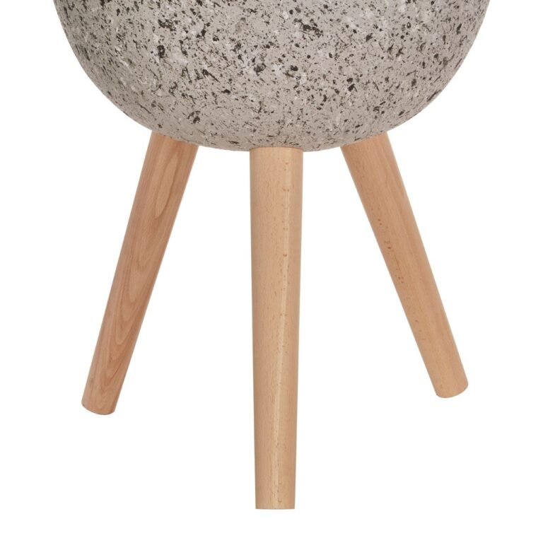 Neil Medium Grey Speckled Planter: The small, rounded planter has a grey colour with a speckled pattern for a textured look. It stands on three legs made from smooth, sustainable beechwood. Use it to display a small pot plant or simply as a neural accent piece.