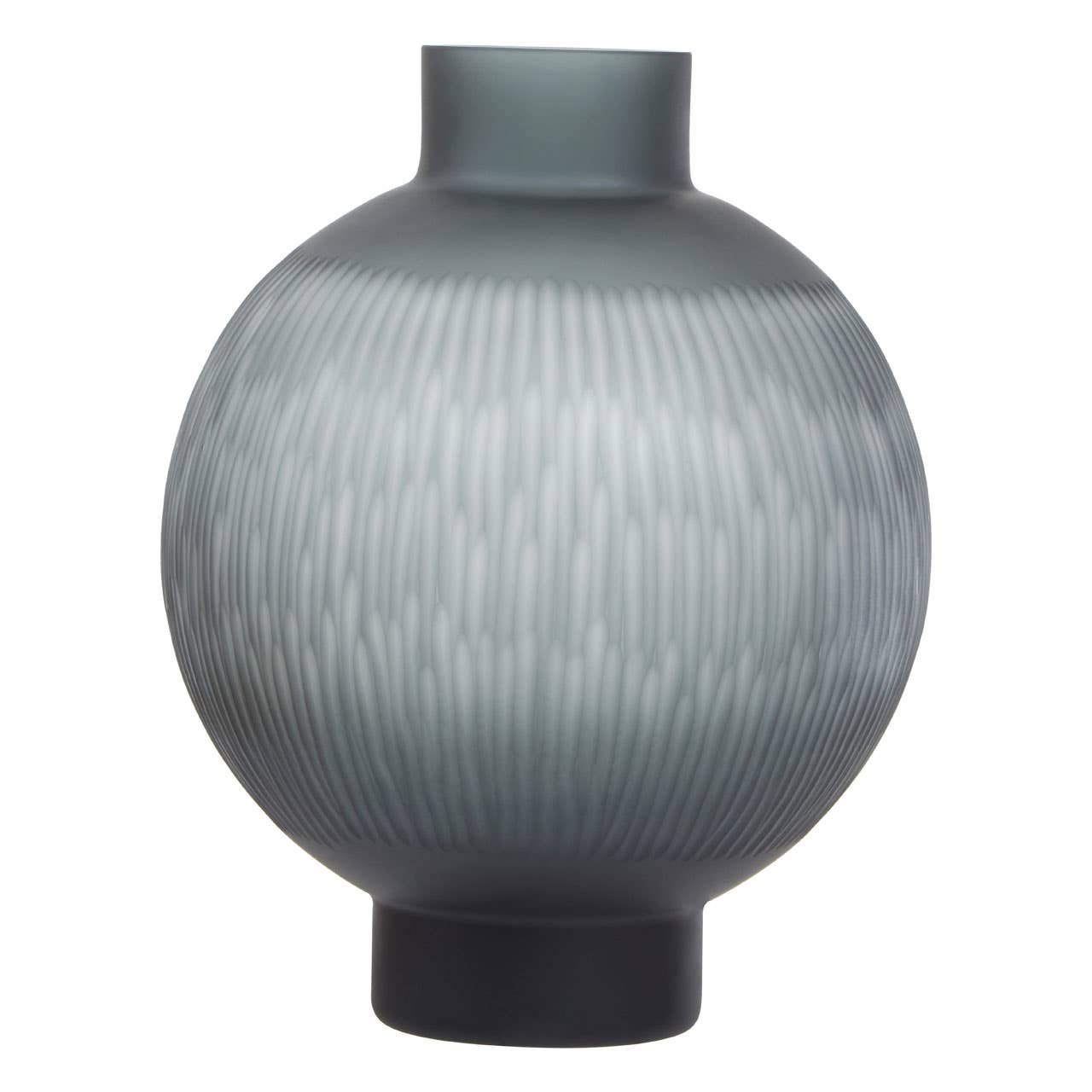 Newbury Large Carved Glass Vase: Boasting a minimal profile with enlarged proportions, the carved detail on this vase will add texture and depth to the floral settings. This standalone vase is handcrafted expertly from glass, and the grey hues exude neutrality and balance on the tabletop
