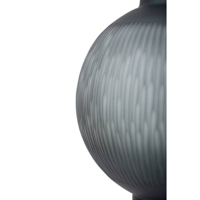 Newbury Large Carved Glass Vase: Boasting a minimal profile with enlarged proportions, the carved detail on this vase will add texture and depth to the floral settings. This standalone vase is handcrafted expertly from glass, and the grey hues exude neutrality and balance on the tabletop
