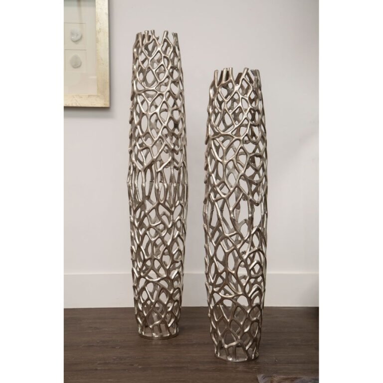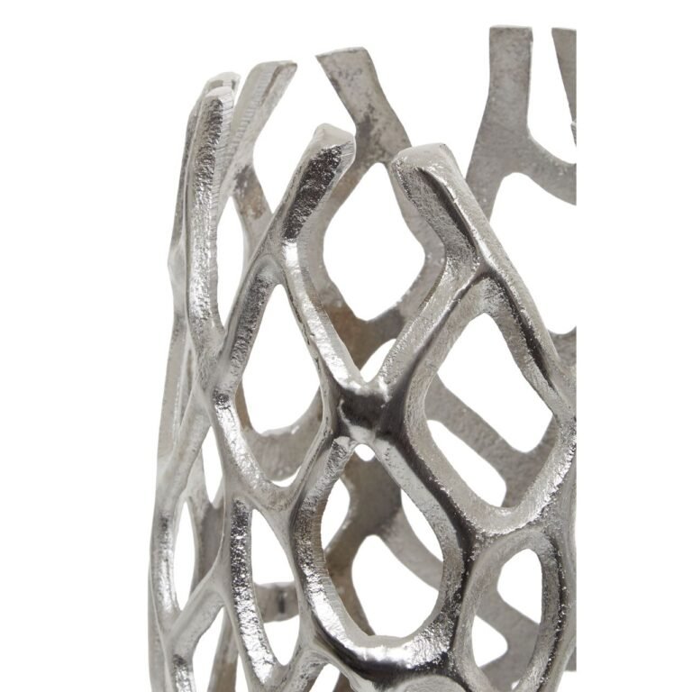 Ralkie Large Silver Finish Vase: This large vase features a coral effect that lends warmth and character in the living area. This vase is intricately handcrafted from robust aluminium and given a silver finish that exudes radiance, and the cut-out design creates a geometric allure.