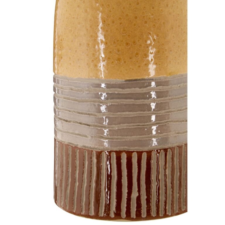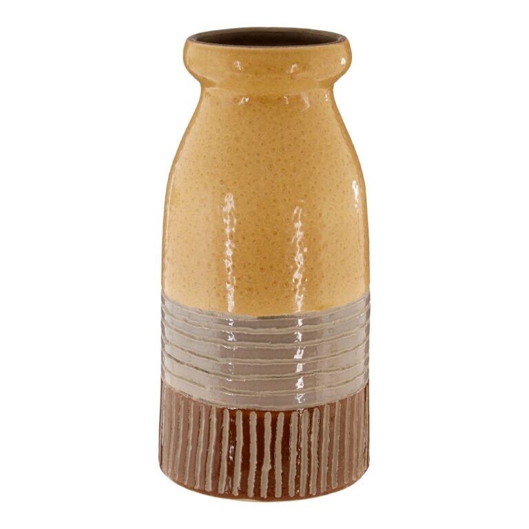 Thornl Earthenware Vase: Shaped like a traditional milk bottle, this earthenware vase is a quirky and colourful accent piece. Its smooth surface features a reflective glazed finish, with mottling adding a hint of texture to the ochre. The lower grey and brown sections are pillared and ribbed, enhancing the visual interest of this handcrafted vase. *This item is handcrafted so please expect slight variations to the finish*