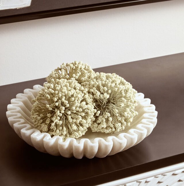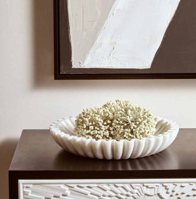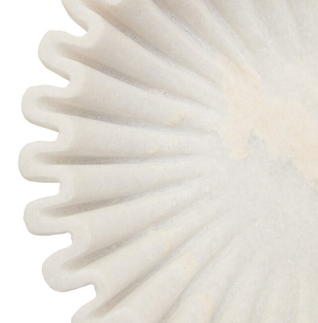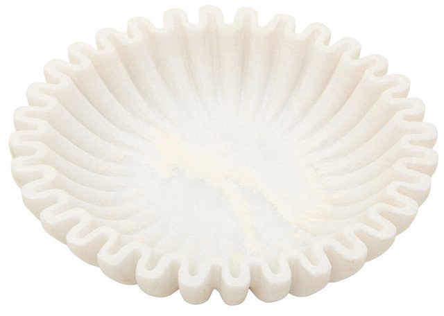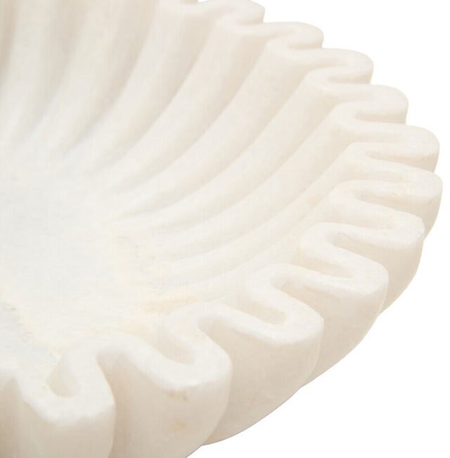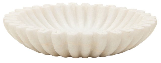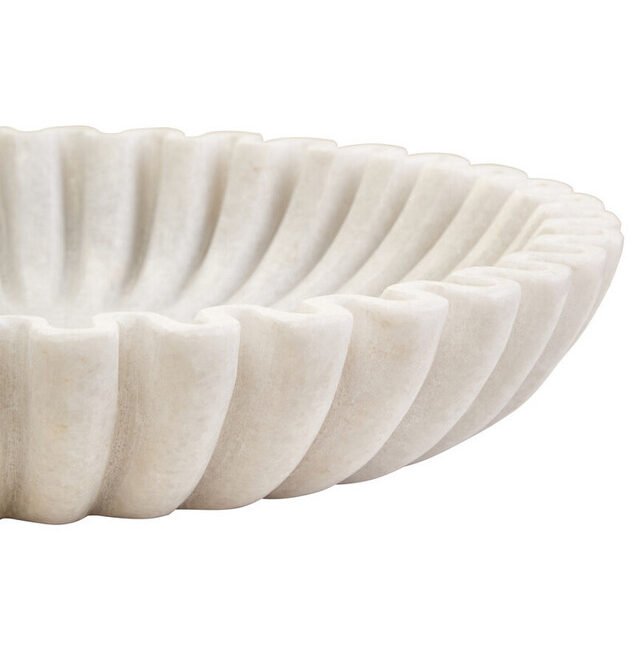 Vasio Fluted Marble Bowl: A stylish and practical accent piece for console tables and coffee tables, this small bowl is expertly handcrafted from white marble. The organic variations and fluted design make it a decorative accent that can be used to display small trinkets.
