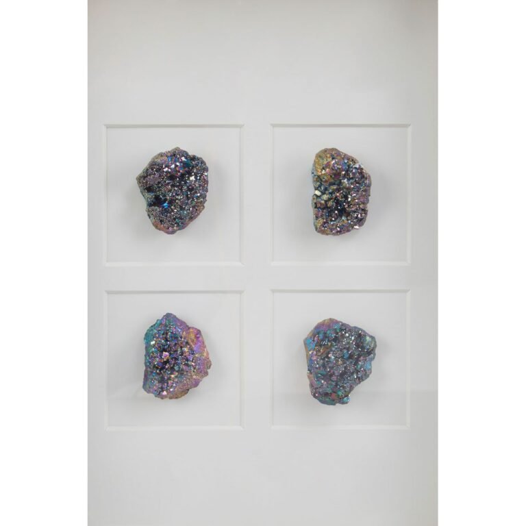 Multi Elm Grey Stone Wall Art: Four stones are mounted against a clean white background and surrounded by a pale toned frame. Each stone has a glittering finish and an irregular form that makes each unit wholly unique. The frame’s subtle silver colour adds a metallic touch to the aesthetic. Coordinate it with silver finish accessories and lighting.