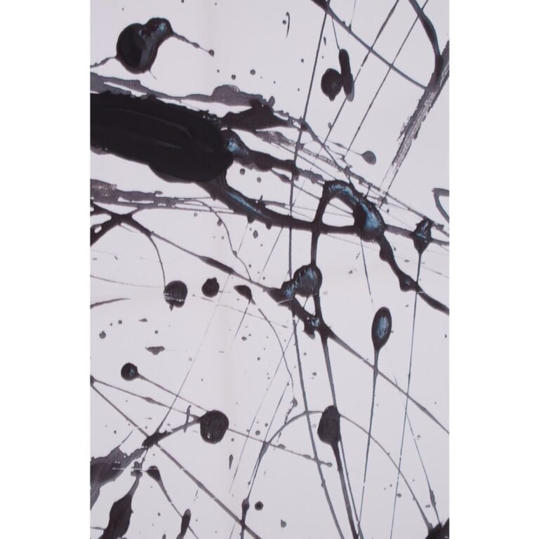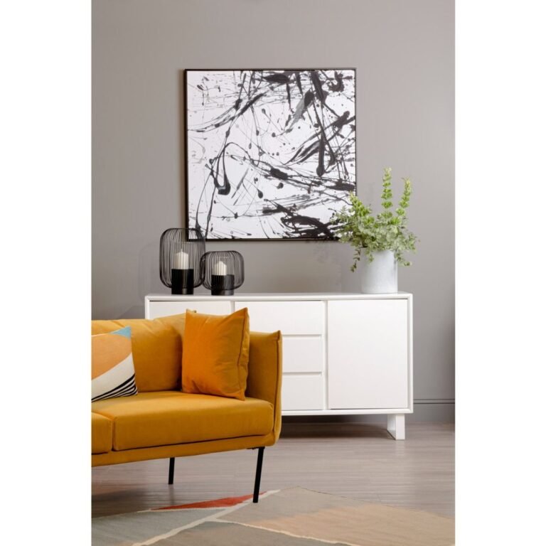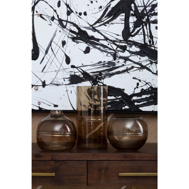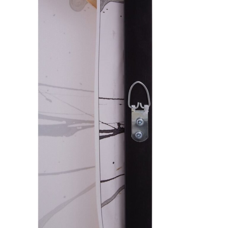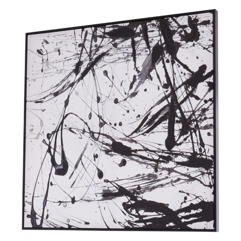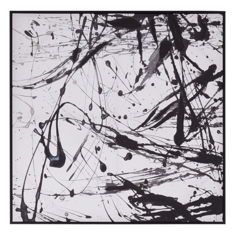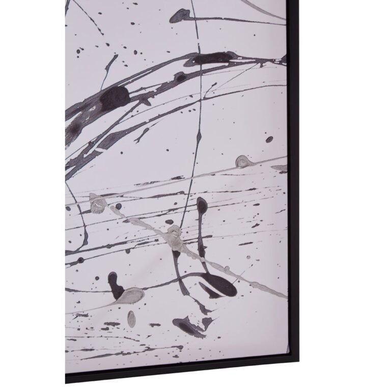This Strata Black / White Wall Art is comprised of white canvas stretched into a frame crafted from natural wood. The canvas is decorated by a kaleidoscopic pattern, the stark black strokes contrasting against the white, with splashes of gold interspersed for warmth. The frame is colored black to coordinate and has a minimal design.