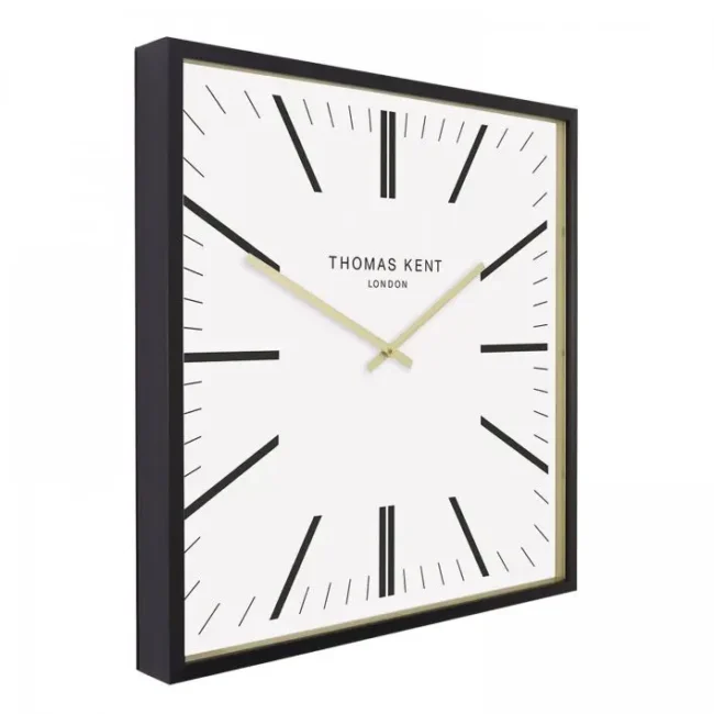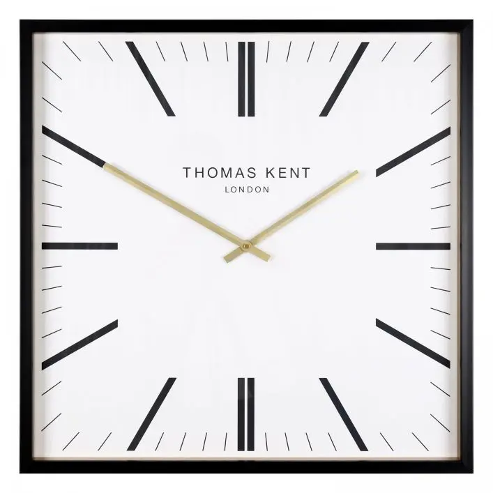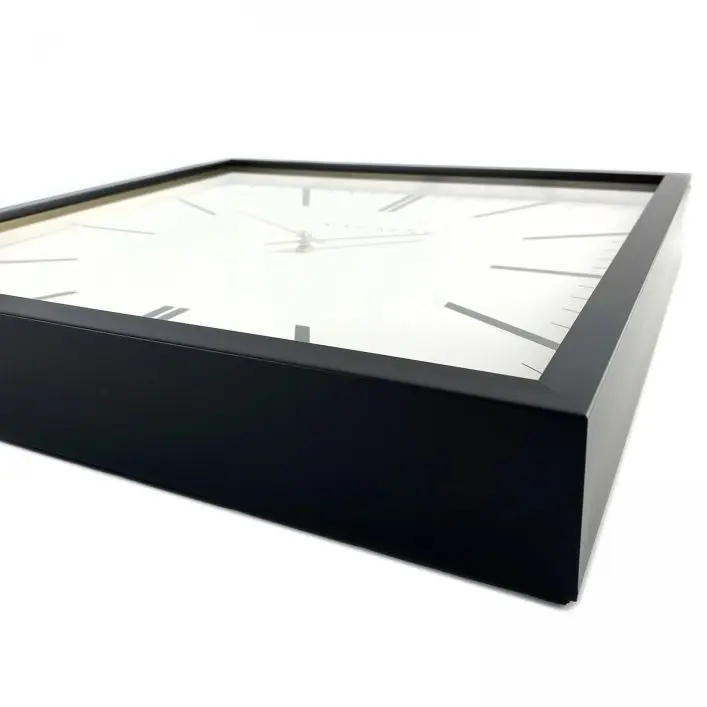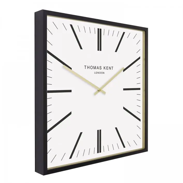 Garr Grand Clock White: A black wooden 24-inch frame sits proudly against an elegant white textured dial. The Garrwick wall clock is a luxury statement piece. Its square face and collection of uncluttered lines add a touch of masculinity to a room design. In contrast, the gold foil inner rim and matching hands create a gentle charm.