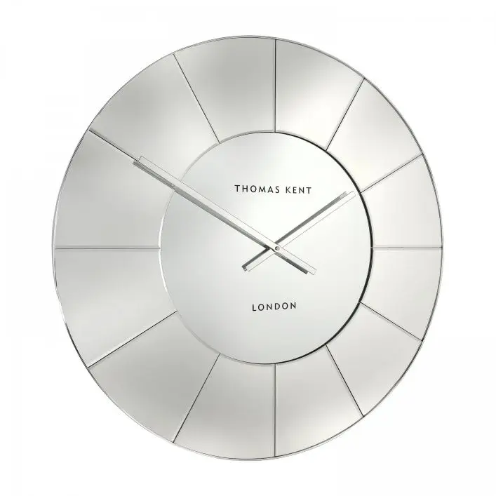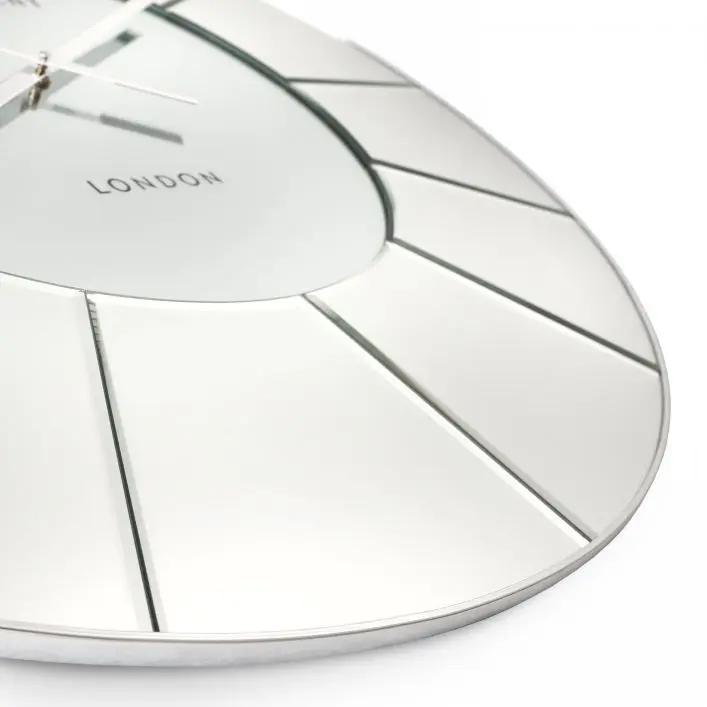 Grand Wall Clock Darcy: Introducing a glamorous wall clock that seamlessly blends style with functionality. Drawing the eye and sparking admiration, twelve stunning mirrored panes, influenced by the Art Deco movement, pivot around the oversized clock face. The delicate joins between the panes transform into minimalistic ticks, a testament to thoughtful design. A circular panel at the heart of the dial homes the contemporary silver hands, reflecting modern sophistication. A discrete, slimline silver frame completes the overall stylish aesthetic.
